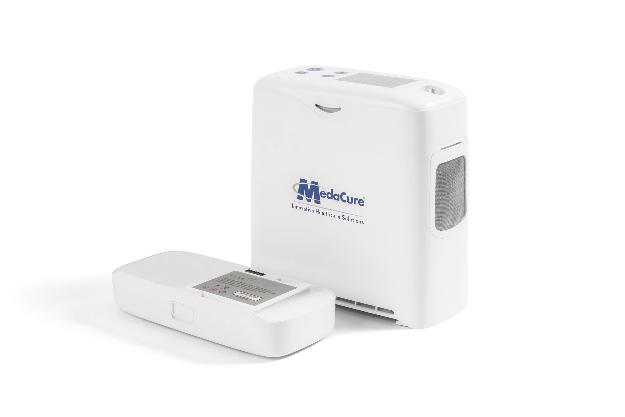 The MedaCure Aerolite (model JM-P50A) is a portable pulse dose oxygen concentrator with six flow settings and a maximum output of 1,260 mL/min. It weighs 4.76 lbs with the standard 8-cell battery and features a full-color 2.8-inch LCD display. It is manufactured by MedaCure and available at Main Clinic Supply for $1,895.